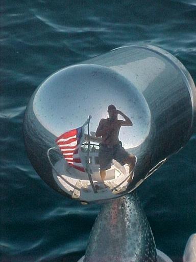 Keywords: Grady spot light.JPG reflected image of spotlight on bow rail of 24' Grady White Gulf Of Mexico Florida Coast My own work 2006-08-12 Sony MVC-FD73 digital camera Author Roy Sedgwick Sedg 2007-02-06 own assumed Sedg~commonswiki Searchlights