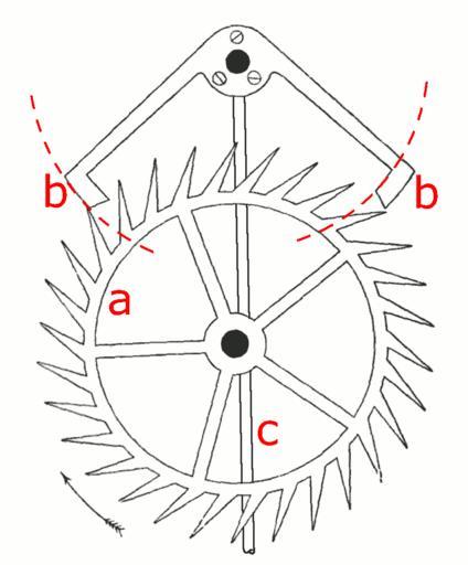 | Keywords: Graham Escapement.png Graham_Escapement svg Drawing of a Graham or deadbeat clock escapement Invented by astronomer Richard Towneley in 1675 and first widely used by British clockmaker George Graham in his precision regulators around 1715 the deadbeat escapement was a more accurate version of the anchor escapement In the 19th century it replaced the anchor escapement as the standard escapement in quality pendulum clocks and is used in almost all modern pendulum clocks Alterations Removed captions and labels replaced labels in color added dotted lines moved arrow from top of wheel to side drew in pendulum crutch Labeled parts a escape wheel b pallets showing concentric locking faces c pendulum crutch Downloaded from http //books google com/books id 5SYJAAAAIAAJ pg PA108 Frederick J Britten 1896 Watch and Clock Maker's Handbook 9th Edition E F N Spon London p 108 on Google Books Published 1896 Frederick J Britten Public domain - author died in 1913 PD-old Graham Escapement |