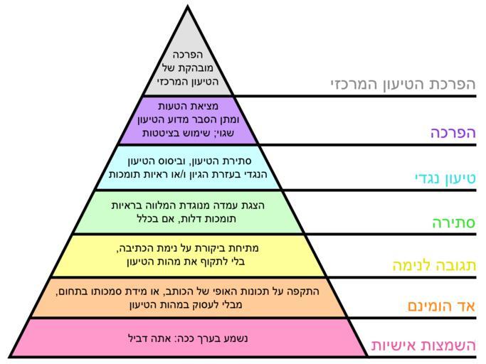 | Keywords: Grahams Hierarchy of Disagreement-Hebrew.png A triangular graphic representing a hierarchy of disagreement from clear refutation to mere vituperation based on the essay http //www paulgraham com/disagree html How to Disagree by Paul Graham hebrew version of Graham's_Hierarchy_of_Disagreement svg by http //webster co il/2011/12/29/2713/ Hanan Cohen 2011-12-31 21 24 UTC Graham's_Hierarchy_of_Disagreement svg Rocket000 derivative work Hanan Cohen Hanan has realised this work into PD in the post mentioned above Hanan Cohen Original upload log This image is a derivative work of the following images File Graham's_Hierarchy_of_Disagreement svg licensed with PD-user 2010-08-01T16 18 26Z LobStoR 707x530 2520 Bytes <nowiki>fix directional quotation mark in Name-calling text</nowiki> 2009-10-17T23 15 45Z DoriSmith 707x530 2518 Bytes <nowiki>Clean up typos in text </nowiki> 2009-03-04T06 05 43Z Arugula999 707x530 2638 Bytes <nowiki>no need for an +2kB inkscape edit just fix the typo in notepad this way it keeps it nice and clean for translations </nowiki> 2008-11-17T19 04 45Z Mfield 707x530 5202 Bytes <nowiki>Ad Hominem correct arguement -> argument</nowiki> 2008-09-05T08 23 47Z Rocket000 707x530 2594 Bytes <nowiki>different font less whitespace</nowiki> 2008-09-05T07 49 29Z Rocket000 730x530 2554 Bytes <nowiki> A triangular graphic representing a hierarchy of disagreement from clear refutation to mere vituperation hand-coded by uploader; based on Image Graham's Hierarchy of Disagreement jpg</nowiki> Uploaded with derivativeFX Argument maps Hierarchy Triangular diagrams Graham's Hierarchy of Disagreement |