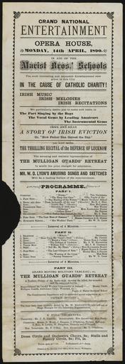 Keywords: text document monochrome An arrangement of text. Items to be performed included: A story of Irish eviction, or "How Father Dan gained the day"; the thrilling recital of the defence of Lucknow; The Mulligan Guards' retreat; Mr W D Lyon's amusing songs and sketches. Performers also included: fifty pupils of Marist Brothers Schools, Mr E J Hill, Miss McCarthy, Mrs Walsh, Miss Katherine Hardy, Mr Prouse, Mr S Ross, Messrs Connolly and E Dunne, Mr W D Lyon, Misses Ross and Jacomb, Mr F W Haybittle. The full orchestra was conducted by Mr J B Connolly. The boys were drilled by Mr W Naughton. The committee included: Messrs D Walsh, J Brennan, J O'Sullivan, Hyland, Mahoney, S Ross, B LArkin, W Naughton, Dennehy and O'Driscoll. Quantity: 1 b&w art print(s) on poster. Physical Description: Letterpress on poster 420 x 142 mm. 396 x 172 mm. Evening Post (Wellington, N.Z.). Grand national entertainment. Opera House, Monday, 14th April, 1890, in aid of the Marist Bros.' Schools. The most interesting and enjoyable entertainment ever given in this city, in the cause of Catholic charity! Irish music, Irish melodies, Irish recitations. Printed at the Evening Post office, Willis-Street, Wellington. [1890].. Ref: Eph-C-VARIETY-1890-01. Alexander Turnbull Library, Wellington, New Zealand. natlib.govt.nz/records/23119675 An arrangement of text. Items to be performed included: A story of Irish eviction, or "How Father Dan gained the day"; the thrilling recital of the defence of Lucknow; The Mulligan Guards' retreat; Mr W D Lyon's amusing songs and sketches. Performers also included: fifty pupils of Marist Brothers Schools, Mr E J Hill, Miss McCarthy, Mrs Walsh, Miss Katherine Hardy, Mr Prouse, Mr S Ross, Messrs Connolly and E Dunne, Mr W D Lyon, Misses Ross and Jacomb, Mr F W Haybittle. The full orchestra was conducted by Mr J B Connolly. The boys were drilled by Mr W Naughton. The committee included: Messrs D Walsh, J Brennan, J O'Sullivan, Hyland, Mahoney, S Ross, B LArkin, W Naughton, Dennehy and O'Driscoll. Quantity: 1 b&w art print(s) on poster. Physical Description: Letterpress on poster 420 x 142 mm. 396 x 172 mm. Evening Post (Wellington, N.Z.). Grand national entertainment. Opera House, Monday, 14th April, 1890, in aid of the Marist Bros.' Schools. The most interesting and enjoyable entertainment ever given in this city, in the cause of Catholic charity! Irish music, Irish melodies, Irish recitations. Printed at the Evening Post office, Willis-Street, Wellington. [1890].. Ref: Eph-C-VARIETY-1890-01. Alexander Turnbull Library, Wellington, New Zealand. natlib.govt.nz/records/23119675 |