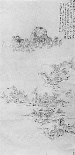 | Keywords: Grand paysage au trait pur, 1846, par le peintre chinois Su Renshan, n° 23 inventaire 17.jpg fr Grand paysage au trait pur Papier 245x118cm Exécuté au Jing-er-gong-bo-shui-xie daté début automne 1846 signé La peinture est froissée doit être remontée Pièce majestueuse d'une saisissante originalité; le pinceau cherche délibérément à imiter le burin des graveurs pour produire un effet d'estampe; cette recherche élargie à une échelle aussi imposante crée un effet d'autant plus surprenant La vie et l'œuvre de Su Renshan Rebelle Peintre et Fou Auteur Pierre Ryckmans Éditeur Imprimerie Cathay Press Ltd Cahier 3 Hong Kong langue français mois septembre année 1970 Image 23 inventaire 17 Cahier 3 passage 125 et 197 Photo en N et B Creator Su Renshan 1846 PD-old-100 Su Renshan |