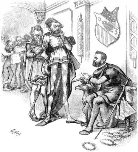 Keywords: Grant asks Schurz to play on a Flute.jpg en With a caption taken from Shakespeare's play Hamlet U S President Ulysses S Grant seated in his throne asks a skeptical Senator Carl Schurz with a concerned Senator Thomas W Tipton standing beside him to play on a flute which he proffers Harper's Weekly April 27 1872 p 321 Creator Thomas Nast 1872-04-27 Caption <span style font-size 120 > NOT SO EASILY PLAYED UPON </span> <table><tr valign top > <td width 49 >   U S G Will you play upon this pipe <br>   C S My lord I can not <br>   U S G 'Tis as easy as lying </i> govern these ventages with your fingers and thumb give it breath with your mouth and it will discourse most eloquent music Look you these are the stops <br>   C S But these can not I command to any utterance of harmony; I have not the skill <br> </td><td width 2 ></td><td width 49 >   U S G Why look you now how unworthy a thing you make of me You would play upon me; you would seem to know my stops; you would pluck out the heart of my mystery; you would sound me from my lowest note to the top of my compass and there is much music excellent voice in this little organ; yet can not you make it speak Why do you think I am easier to be played on than a pipe Call me what instrument you will though you can fret me you can not play upon me Hamlet Act III Scene II </td></tr></table> PD-old-100 Caricatures of Carl Schurz Thomas Nast Thomas W Tipton Caricatures of Ulysses S Grant 1872 cartoons 1870s political cartoons of the United States Hamlet Act III Scene II