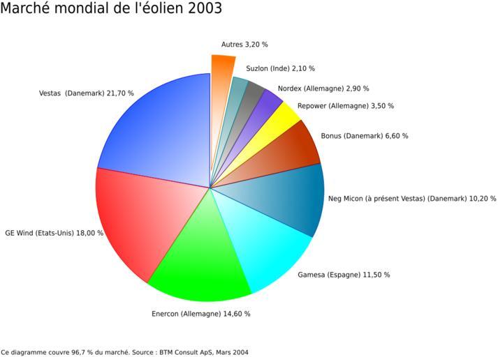 Keywords: Graphique marche eolien 2003 (2).svg Graphique du marché de l'éolien en 2003 Amélioration du fichier media Graphique_marche_eolien_2003 svg User Fabien1309 Atelier graphique SVG pie charts