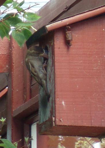 Keywords: Gråspurv fodrer unge.JPG House Sparrow feeding young in a nest box in Denmark Hun-gråspurv fodrer unge Danmark own Brams 2006-07-27 Passer domesticus female feeding at nest WikiProject Birds Passer domesticus in Denmark Bird nest boxes