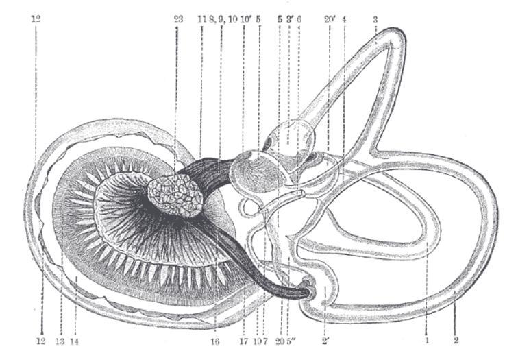 | Keywords: Gray926.png The same from the postero-medial aspect 1 Lateral semicircular canal; 1 its ampulla; 2 Posterior canal; 2 its ampulla 3 Superior canal; 3 its ampulla 4 Conjoined limb of superior and posterior canals sinus utriculi superior 5 Utricle 5 Recessus utriculi 5 Sinus utriculi posterior 6 Ductus endolymphaticus 7 Canalis utriculosaccularis 8 Nerve to ampulla of superior canal 9 Nerve to ampulla of lateral canal 10 Nerve to recessus utriculi in Fig 925 the three branches appear conjoined 10 Ending of nerve in recessus utriculi 11 Facial nerve 12 Lagena cochleæ 13 Nerve of cochlea within spiral lamina 14 Basilar membrane 15 Nerve fibers to macula of saccule 16 Nerve to ampulla of posterior canal 17 Saccule 18 Secondary membrane of tympanum 19 Canalis reuniens 20 Vestibular end of ductus cochlearis 23 Section of the facial and acoustic nerves within internal acoustic meatus the separation between them is not apparent in the section G Retzius Other fields 1 Information field Ucfirst Plate 926 before 1858 Henry Gray Anatomy of the Human Body See Book section below 926 Creator Henry Vandyke Carter Book Gray's Anatomy PD-old-100-1923 Gray's Anatomy plates 0926 Inner ear Sensory Neuroscience Hearing and speech Anatomical plates and drawings of the human ears |