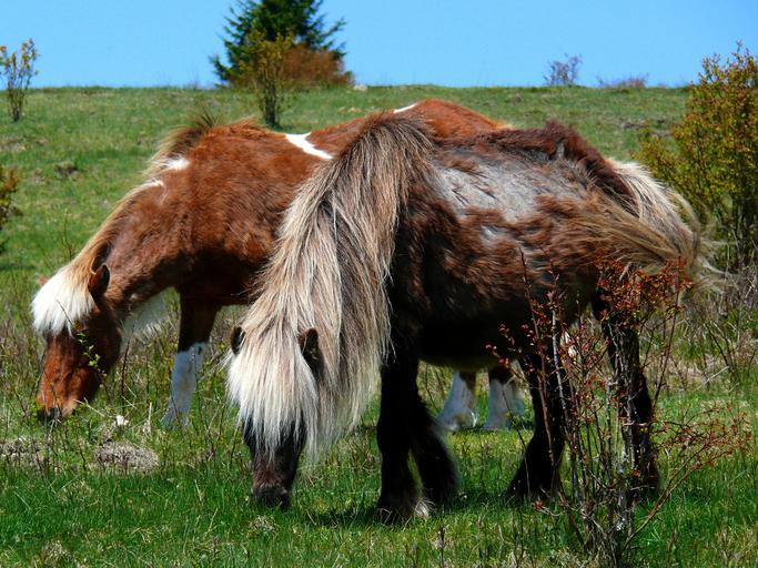 Keywords: Grayson Highlands Ponies-27527-3.jpg A pair of ponies feed in the grass These are members of an introduced herd of wild ponies that has lived on the balds of Wilburn Ridge in Grayson Highlands State Park for over 50 years <br />Photo taken with a Panasonic Lumix DMC-FZ50 in Grayson County VA USA <br />Cropping and post-processing performed with The GIMP http //www kenthomas us KenThomas us <br /> personal website of photographer 2009-05-12 10 56-04 <sup>ISO 8601</sup> Ken Thomas This image is released to the public domain and therefore no permission or credit is required <br />Comments and/or feedback however are always welcome Please see my user page or http //kenthomas us my personal website for details and contact info 36 38 29 41 N 81 30 54 73 W heading W Grayson Highlands Ponies Horse coat colors Silver dapple horses Chestnut tobiano Computer wallpaper Taken with Panasonic Lumix DMC-FZ50 Horse coat |