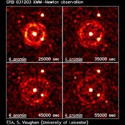 | Keywords: GRB 031203 4panel.gif en The European Space Agency's X-ray observatory XMM-Newton has imaged a spectacular set of rings which appear to expand with a speed a thousand times faster than that of light around the point in the sky where a powerful gamma-ray explosion took place in early December This is the first time that such a fascinating event called an `echo' is seen in X-ray wavelengths This echo forms when the powerful radiation of a gamma-ray burst coming from far away crosses a slab of dust in our Galaxy and scattered by it like the beam of a lighthouse in clouds Using the expanding rings to precisely pin-point the location of this dust astronomers can identify places where new stars and planets are likely to form Credit Simon Vaughan University of Leicester ESA ESA and PPARC url http //www star le ac uk/~sav2/grb031203/ Simon Vaughan 2003-03-12 I sent an email to Simon Vaughan He responded that The images on this page http //www star le ac uk/~sav2/grb031203/ are all public domain On 2003 December 03 Wednesday at 22 01 GMT the Integral satellite recorded a burst of gamma-rays in its IBIS detector from the Imager on Board the Integral Satellite The burst lasted for about 30 seconds and then faded An automatic detection system IBAS - Integral Burst Alert System sent out a message over the internet less than 1 5 hours later Then about 6 hours and 10 minutes after the burst at 04 10 GMT on 2003 December 04 the orbiting X-ray observatory XMM-Newton started observing in this direction and saw in X-rays the fading afterglow of the gamma-ray burst The XMM-Newton observation lasted for just longer than 16 hours Cc-zero X-ray astronomy Gamma ray bursts XMM-Newton |