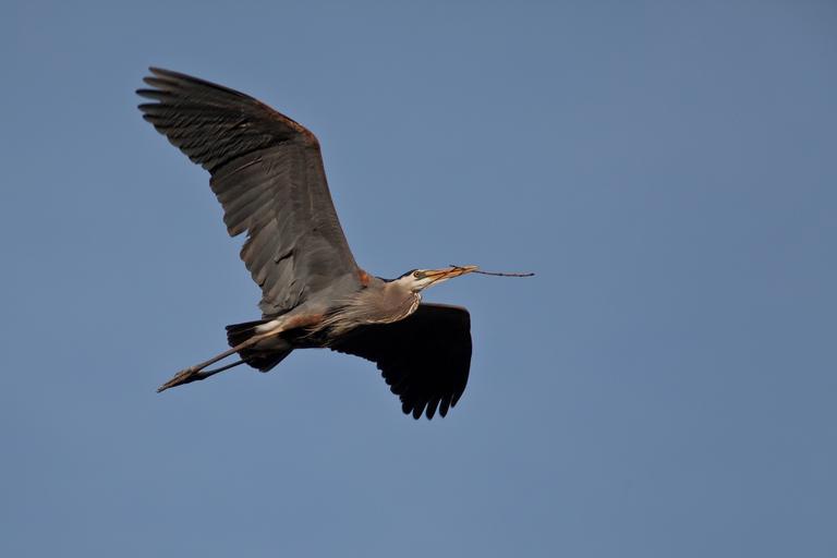Keywords: great blue heron flying bird wild beak neck sky wildlife nature wings plumage wetland feathers flight