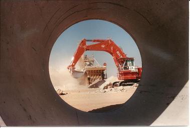 Keywords: Great Man Made River Libya.jpg en Work on trench digging for waterpipe dimensions trench ca 10x10 m Jaap Berk The Netherlands Jaap Berk 1988 Location Libya ca 100km south of Marsa el Brega 28 000N 19 966E Water pipelines Excavators