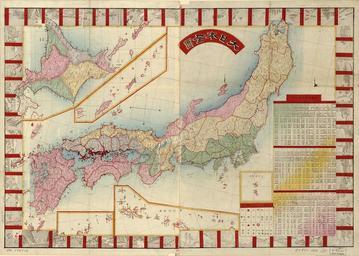 Keywords: Great Map of Japan WDL9930.png Artwork ru агакубо Секисуи 1717 1801 гг fr Nagakubo Sekisui 1717-1801 en Nagakubo Sekisui 1717-1801 zh 长久 赤水,1717-1801 年 pt Nagakubo Sekisui 1717-1801 ar ناغاكوبو سكيسوي، 1717-1801 es Nagakubo Sekisui 1717-1801 ru Большая ка та Японии fr Grande carte du Japon en Great Map of Japan zh 大日 全图 pt Mapa grande do Japão ar الخريطة الكبرى لليابان ru Эта ка та Японии является копией ка ты впе вые напечатанной в 1779 г агакубо Секисуи 1717 1801 гг на кото ой впе вые были отмечены па аллели и ме идианы Заме ы позволили сделать более точное геог афическое изоб ажение по с авнению с п едыдущими богато иллюст и ованными ка тами Ка та имела комме ческий успех и была много аз пе епечатана и скопи ована в эпоху ейдзи 1868 1912 гг В этом экземпля е на полях помечены основные достоп имечательности в том числе х амы и места поклонения ста ые замки и живописные пейзажи К оме того отмечены основные до оги и асстояния мо ских путей а также таблица <em>gun</em> уездов сп ава внизу а пяти вставках изоб ажены азличные г уппы японских ост овов fr Cette carte du Japon qui est une réplique d'une carte publiée en premier lieu en 1779 par Nagakubo Sekisui 1717 1801 fut la première en son genre à inclure les latitudes et les longitudes Les mesures permettent une représentation géographique plus précise que les cartes picturales ornées antérieures Constituant un succès commercial elle fut réimprimée et imitée à de nombreuses reprises au cours de l'ère Meiji 1868 1912 Cette carte inclut les points d'intérêt majeurs dans les marges notamment les temples et les sanctuaires les anciens châteaux et les paysages pittoresques Elle indique également les principales artères et les distances des routes maritimes En bas à droite un tableau répertorie les <em>gun</em> districts Les différents groupes d'îles du Japon sont insérés dans cinq cartouches en This map of Japan is a replica of a map that was first published in 1779 by Nagakubo Sekisui 1717 1801 the first of its kind to include latitude and longitude lines The measurements allowed for a more accurate geographic representation than previous ornate pictorial maps It was a commercial success and was reprinted and imitated numerous times into the Meiji era 1868 1912 This map includes major points of interest on the margins including temples and shrines old castles and scenic landscapes It also notes major thoroughfares and distances of sea routes as well as a table of <em>gun</em> districts on the lower right Five insets depict Japan s various island groups zh 这幅日 图是长久 赤水(Nagakubo Sekisui,1717-1801 年)于 1779 年首次出版的 图的副 ,他首 先河,将经度线和纬度线纳入 图中 与之前装饰华丽的 图相比,加上经度线和纬度线的 图可以更精确 展示 理位置 这幅 图 商业上获得成功, 明治时代(1868 1912 年)之前被数次重印和仿制 图的边缘处介绍了主要景点,包括寺庙和神社 古 的城堡和优美的景观 图上还标出了主要街道和海上航线的 离,右下角 份 区列表 五幅插图描绘了日 的各个岛屿群 pt Este mapa do Japão é uma réplica de um mapa que foi publicado pela primeira vez em 1779 por Nagakubo Sekisui 1717 1801 o primeiro de seu tipo a incluir linhas de latitude e longitude As medidas permitiam uma representação geográfica mais precisa do que os mapas figurativos ornamentados de antes Ele foi um sucesso comercial e foi reimpresso e copiado várias vezes até a era Meiji 1868 1912 Este mapa inclui os principais pontos de interesse nas margens como templos e santuários castelos antigos e paisagens cênicas Traz ainda as principais vias públicas e distâncias de rotas marítimas bem como uma tabela de <em>gun</em> distritos na parte inferior direita Cinco inserções relatam os vários grupos de ilhas do Japão ar تُعد خريطة اليابان هذه نسخة طبق الأصل من خريطة نشرها ناغاكوبو سكيسوي 1717-1801 لأول مرة في 1779، وهي أول خريطة توضح خطوط العرض والطول ساعدت القياسات على خلق تمثيل جغرافي أكثر دقة عن سابقتها من الخرائط التصويرية المزخرفة وحققت الخريطة نجاحاً تجارياً وأُعيدت طباعتها ومحاكاتها عدة مرات في عصر مييغي 1868-1912 تُوضح هوامش هذه الخريطة المعالم الرئيسية للدولة، والتي تشمل معابد وأضرحة وقلاعاً قديمة ومناظر طبيعية خلابة كما تُظهر الممرات المائية وأطوال الطرق البحرية الرئيسية، إضافة إلى جدول <em>غون </em> للمقاطعات أسفل اليمين هناك خمس مجموعات خرائط مُدرَجة تُمثل مجموعات الجزر المختلفة باليابان es Este mapa de Japón es una reproducción de un mapa de Nagakubo Sekisui 1717-1801 que se publicó por primera vez en 1779 el primero de este tipo que incluyó líneas de latitud y longitud Las mediciones permitieron una representación geográfica más precisa que los anteriores mapas pictóricos ornamentales Fue un éxito comercial y se reimprimió e imitó en numerosas ocasiones en la era Meiji 1868-1912 Este mapa tiene los princi