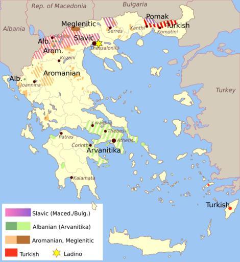 MAKE A MEME View Large Image Greece linguistic minorities.svg Areas with significant traditional presence of linguistic minorities in Greece Arvanitika Albanian Aromanian Megleno-Romanian Macedonian Slavic Pomak Bulgarian Turkish Ladino General outline and idea after a ...