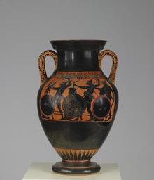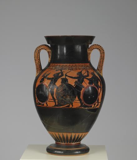 MAKE A MEME View Large Image Greek - Black-figure Amphora - Walters 4810 - Side B.jpg This vase depicts two warriors in combat flanked by two women on side A and three kneeling Greek warriors and three standing bowmen on side B ca 530 BC terracotta H 22 1/4 x W 13 3/8 ...