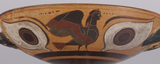 Keywords: Greek - Black-figure Kylix with Sirens - Walters 4837 - Detail A.jpg Homer does not describe the physical appearance of the Sirens but their tantalizing beauty and alluring song captured the interest of commentators throughout antiquity The Sirens are depicted as composite creatures as early as the 8th century BC a motif perhaps derived from Egyptian sources The earliest types such as those seen here are shown simply with women's heads and birds' bodies without arms or hands Sirens occur not only in narrative scenes with Odysseus and his men but also as decorative motifs as do sphinxes ; during the Classical period they come to have associations with funerary iconography The two-handled vase shown here is a type of kylix known as an eye cup which would resemble a mask when raised to the lips during the symposium The simple black-slip interior reveals several small holes around the handles that were used for repairs in antiquity On the exterior a similar composition dominates each side of the vase in a single band Between two large eyes stands a siren; on one side the siren faces frontally to the right on the other side she turns her head looking back Their full wings are simply drawn with bands of added red pigment Beneath their feet runs a simple ground line of black glaze Above each siren are traces of an inscription perhaps the signature of the potter or painter though it is no longer readable century 6 BC terracotta H 4 1/2 x W 11 13/16 x Diam at rim 9 1/16 in 11 5 x 30 x 23 cm accession number 48 37 16991 Don Marcello Massarenti Collection Rome before 1897 mode of acquisition unknown Henry Walters city Baltimore Walters Art Museum Henry Walters Acquired by Henry Walters with the Massarenti Collection 1902 Things With Wings Mythological Figures in Ancient Greek Art The Walters Art Museum Baltimore 2005-2006 Things With Wings Mythological Figures in Ancient Greek Art Ward Museum Salisbury 2009 Heroes Mortals and Myths in Ancient Greece The Walters Art Museum Baltimore; Frist Center for the Visual Arts Nashville; San Diego Museum Of Art San Diego; Alexander S Onassis Public Benefit Foundation USA New York 2009-2011 place of origin Attica Greece Walters Art Museum license Eye-cups Ancient Greek black-figure pottery in the Walters Art Museum Art from Greece Sirens in ancient Greek art Media contributed by the Walters Art Museum needs category review