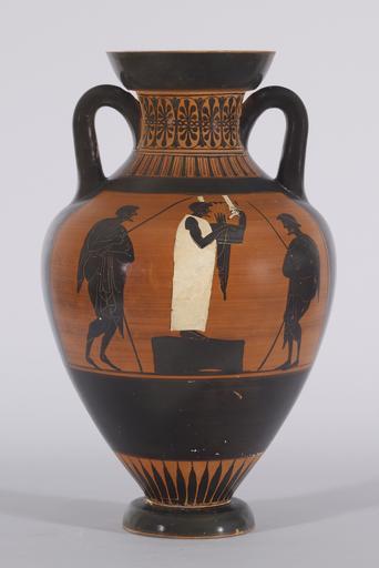 Keywords: Greek - Black-figure Pseudo-Panathenaic Amphora - Walters 482107 - Side B.jpg The image on the obverse of this amphora may represent the mousikoi agones or musical competitions of the Panathenaic festival Bundrick 2005 160-74 In the center of the scene a bearded man clad in an ankle-length white chiton stands on a bema or podium Facing right he holds a large seven-stringed kithara in this left hand With his right hand he plays the instrument using a plectrum attached by a string The kithara's cover hangs below Added white paint has been applied to the arms of the elaborate kithara to simulate ivory One man stands on either side of the bema perhaps representing spectators trainers or judges of the competition The kithara was a highly esteemed instrument in Archaic Greece and both Apollo and Orpheus were mythological models for human performers Shapiro 1992 69 Herodotus 1 23-24 reports the story of Arion a highly regarded and successful kitharode who was thrown overboard from a ship by men who conspired to rob him According to the tale Arion was saved by a dolphin and returned to shore unharmed which suggests that kitharodes were believed to have enjoyed the patronage of Apollo The image on this vase finds a heroic counterpart in the representation of Herakles Mousikos in which the hero appears as the performer often with Olympic deities as spectators On the amphora's obverse Athena strides to the left wearing her characteristic helmet and scaly aegis The goddess wields a spear and holds a large shield decorated with a soaring eagle Two Doric columns each with a rooster perched on top flank the goddess This is the standard configuration for one side of the Panathenaic amphora which was given as a prize at the quadrennial games in honor of the patron goddess of Athens However the size of this vase and the lack of an inscription indicate that it was not actually used as a prize ca 500 485 BC terracotta cm 44 26 9 accession number 48 2107 3696 William Randoph Hearst San Simeon date and mode of acquisition unknown Garrett Chatfield Pier Sale Anderson Galleries 1958 Walters Art Museum 1958 by purchase Museum purchase 1958 Heroes Mortals and Myths in Ancient Greece The Walters Art Museum Baltimore; Frist Center for the Visual Arts Nashville; San Diego Museum Of Art San Diego; Alexander S Onassis Public Benefit Foundation USA New York 2009-2011 place of origin Attica Greece Walters Art Museum license Ancient Greek black-figure pottery in the Walters Art Museum Art from Greece Pseudo-Panathenaic amphoras Citharas Chiton |