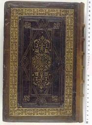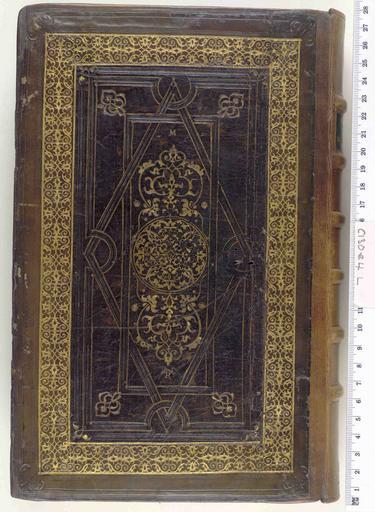 Keywords: -Greek-. Homeri Ilias et Ulyssea cum interpretatione -of Didymus-. - Lower cover (c130e4).jpg Style Lozenge or diamond; Caption Lower cover; Colour Brown; Edge Unspecified exhibition history Decorative Technique Tooled in gold; Cover Material Goatskin includes morocco turkey etc Macchi states; ca 1540-1545 Paris Italianate taste see Bibliothèque nationale de France Paris 80 reliures françaises p 2 n 24 J de Sauzay coat-of-arms; J Guignard Premières reliures parisiennes à décor doré p 229-249; F Macchi - L Macchi Il Dizionario illustrato della legatura p 136; J Toulet Les reliures p 533 - C 108 tt 2 Davis 334 Davis 335 Davis 366 Davis 369 considering 1 Border T de Marinis La legatura artistica II p 96 n 1839 pl CCCXLVII ; 2 stylized threefoils along the bows shaped internal cartouche; 3 the couple of opposite fleur-de-lis looking tools in the central cartouche G D Hobson Weiland dr Theodor Gottlieb und seine žGrolierstudien p 83 See Livres des XVe XVIe siècles dans leurs reliures originales p 84 n 216 pl 26 on Titi Livii Patavini latinae historiae principis decades tres Basileae officina Frobeniana 1535 object history Text 1535; Basel; Unspecified object type Cc-zero place of creation Binding France place of discovery Unspecified British Library image http //www bl uk/catalogues/bookbindings/LargeImage aspx RecordId 020-000006766 ImageId ImageId 42988 Copyright BL Greek Homeri Ilias et Ulyssea cum interpretatione of Didymus Uploaded with GWToolset Greek Homeri Ilias et Ulyssea cum interpretatione of Didymus - Lower cover c130e4 http //www webarchive org uk/bldatasets/bindings/7533_4 jpg Bookbinding 16th-century bookbinding British Library Bookbindings |