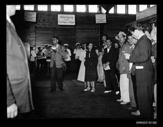 Keywords: blackandwhite monochrome black and white Greek migrants arriving at (possibly) Bremerhaven from Camp Lesum prior to embarking on the FAIRSEA, August 1953. Notices on wall at back read, from left to right: `?Lessen sie ihr gepack reisenbehnemflich abfertigen have your baggage registered to final destination' [2].`Abfertigung von frachtgut u. Eilgut'. [3]. As for [1]. An inscription on the reverse reads: `Greek migrants arriving from Camp Lesum prior to embarking on FAIRSEA 6.8.1953.' In the lower right corner is a black ink stamp reading: 'ICEM photograph no.450...' (Intergovernmental Committee for European Migration) The ANMM undertakes research and accepts public comments that enhance the information we hold about images in our collection. Object no. ANMS0214[108] The Australian National Maritime Museum will be holding an after-dark lightshow based on stories of migration from 26 January to 17 February 2013. Check the website for more information on 'Waves of Migration', and how you can tell share your migration story. Greek migrants arriving at (possibly) Bremerhaven from Camp Lesum prior to embarking on the FAIRSEA, August 1953. Notices on wall at back read, from left to right: `?Lessen sie ihr gepack reisenbehnemflich abfertigen have your baggage registered to final destination' [2].`Abfertigung von frachtgut u. Eilgut'. [3]. As for [1]. An inscription on the reverse reads: `Greek migrants arriving from Camp Lesum prior to embarking on FAIRSEA 6.8.1953.' In the lower right corner is a black ink stamp reading: 'ICEM photograph no.450...' (Intergovernmental Committee for European Migration) The ANMM undertakes research and accepts public comments that enhance the information we hold about images in our collection. Object no. ANMS0214[108] The Australian National Maritime Museum will be holding an after-dark lightshow based on stories of migration from 26 January to 17 February 2013. Check the website for more information on 'Waves of Migration', and how you can tell share your migration story. |