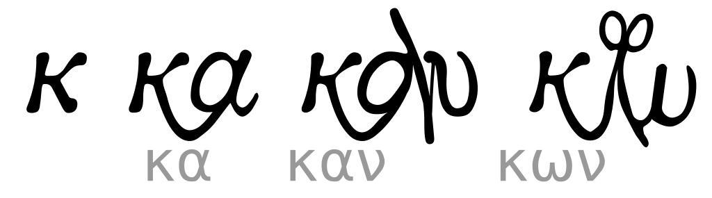 | Keywords: Greek minuscule Kappa with ligatures.svg en Samples of ligatures involving Greek letter Kappa in medieval minuscule handwriting and early modern printing own based on glyphs in the Rgreekl2 font made by Vernon Kooy http //schmidhauser us/tools/rgl/rgreekl2 pdf Fut Perf 2010-08-14 Kappa letter Greek ligatures κ |