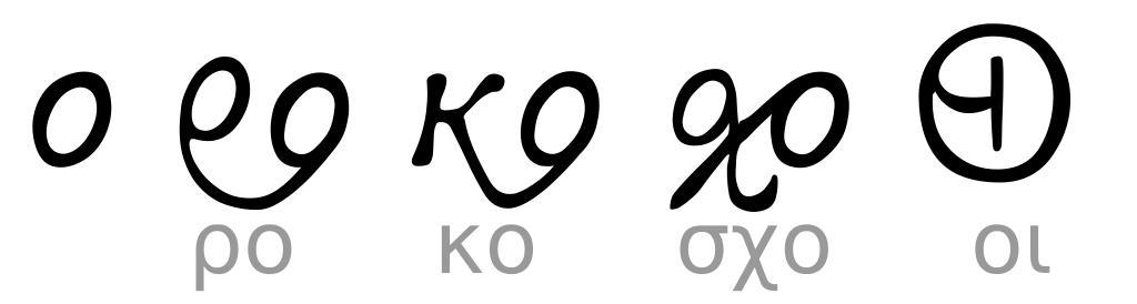 | Keywords: Greek minuscule Omikron with ligatures.svg en Samples of ligatures involving Greek letter Omicron in medieval minuscule handwriting and early modern printing own based on glyphs in the Rgreekl2 font made by Vernon Kooy http //schmidhauser us/tools/rgl/rgreekl2 pdf Fut Perf 2010-08-14 Omicron letter Greek ligatures ο |