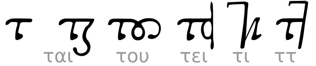 | Keywords: Greek minuscule Tau with ligatures.svg en Samples of ligatures involving Greek letter Tau in medieval minuscule handwriting and early modern printing own based on glyphs in the Rgreekl2 font made by Vernon Kooy http //schmidhauser us/tools/rgl/rgreekl2 pdf Fut Perf 2010-08-14 Tau letter Greek ligatures τ |