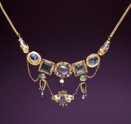 | Keywords: Greek - Necklace with Butterfly Pendant - Walters 57386.jpg Elaborate diadems or necklaces featuring centerpieces of inlaid stones pendants and beaded chains go back to 3rd- and 2nd-century Greek jewelry This necklace was found on the neck of the deceased; as the symbol of the soul the butterfly was an appropriate motif for a burial gift late 2nd-1st century BC Hellenistic gold amethyst chalcedony emerald rock crystal pearl and colored glass cm 7 5 33 1 3 ; cm 32 7 l accession number 57 386 2800 Discovered in 1891 in a tomb near Olbia Parutino Ukraine Postnikov Moscow by purchase from a local dealer in Ukraine Spinks London by purchase around the turn of the century Peter Mavrogordato 1913 by purchase on the art market Collection of F L van Gans Frankfurt 1913-1921 by purchase Galerie Bachstitz The Hague Henry Walters Baltimore 1921-1931 by purchase Walters Art Museum Henry Walters Acquired by Henry Walters between 1921 and 1931 Jewelry - Ancient to Modern The Walters Art Gallery Baltimore 1979-1980 From Alexander to Cleopatra Greek Art of the Hellenistic Age The Walters Art Gallery Baltimore 1988-1989 place of origin Greece Walters Art Museum license Ancient Greek art in the Walters Art Museum Jewellery in the Walters Art Museum Art from Greece Media contributed by the Walters Art Museum needs category review Ancient Greek jewellery of Olbia Olbia Ukraine |
