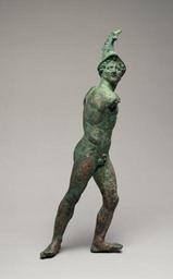 | Keywords: Greek - Nude Warrior - Walters 541046 - Profile.jpg The dramatic posture and exaggerated twist of the neck date this piece to the mid Hellenistic period The pose implies the presence of at least one other figure The blue-green color modeling of the muscles and unpolished surface are typical of works from Alexandria late 3rd-2nd century BC Hellenistic cast bronze with core cm 28 9 5 9 3 accession number 54 1046 3177 Fayum Dikran Kelekian Paris and New York date and mode of acquisition unknown Henry Walters city Baltimore Walters Art Museum Henry Walters Acquired by Henry Walters 1913 From Alexander to Cleopatra Greek Art of the Hellenistic Age The Walters Art Gallery Baltimore 1988-1989 place of origin Alexandria Egypt Walters Art Museum license Ancient Greek sculptures in the Walters Art Museum Art from Greece Media contributed by the Walters Art Museum needs category review |