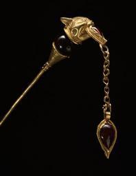 Keywords: Greek - Pin with Lynx Head - Walters 57384 - View A.jpg The top of the gold pin is a finely modeled lynx head A small molding on the shaft of the pin keeps the garnet bead and conical collar from slipping off One setting with a tear-drop garnet is firmly fixed in the lynx's mouth by a pin the extremity of which is looped Chained to the loop is a second tear-drop garnet century 1 BC Hellenistic gold garnets cm 19 accession number 57 384 9557 Collection of F L van Gans Frankfurt date and mode of acquisition unknown Galerie Bachstitz The Hague Henry Walters city Baltimore Walters Art Museum Henry Walters Acquired by Henry Walters 1921 Jewelry - Ancient to Modern The Walters Art Gallery Baltimore 1979-1980 place of origin Greece Walters Art Museum license Ancient Greek art in the Walters Art Museum Jewellery in the Walters Art Museum Art from Greece Media contributed by the Walters Art Museum needs category review |