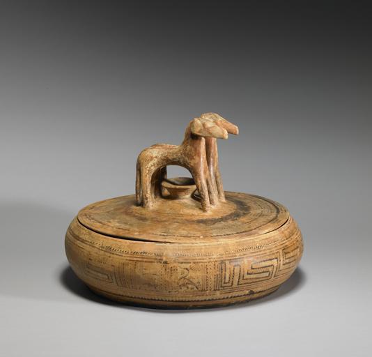| Keywords: Greek - Pyxis and Lid with Two Standing Horses - Walters 482029 - Three Quarter.jpg The horse pyxis was made only in Athens Many examples have been found in the graves of women and are thought to have held food offerings or personal items of the deceased The horses on the lid which served as a handle may reflect the prominent status of the owner's family as horses were associated with the aristocracy during this period century 8 BC Geometric terracotta cm 25 34 3 accession number 48 2029 40478 N Koutoulakis Galerie Segredakis Paris Walters Art Museum 1950 by purchase Museum purchase with funds provided by the S A P Fund 1950 In Search of Ancient Treasure 40 Years of Collecting The Walters Art Gallery Baltimore 1978 place of origin Athens Greece Walters Art Museum license Ancient Greek pottery in the Walters Art Museum Horse pyxides Media contributed by the Walters Art Museum needs category review |