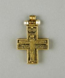 Keywords: Greek - Reliquary Pendant with Virgin and Child - Walters 571511.jpg This exceptional pendant consists of a reliquary cross inside a hinged case with six small adjacent compartments for relics The impressive amethyst cameo depicting the Virgin and Child on the lid is surrounded by cabochon rubies and emeralds alternating with pearls The cross and the outer edge of the case are adorned with additional pearls and the back of the case is decorated in a similar fashion omitting the central cameo A ground of dense filigree covers the front and back of the case while the inside as well as the inscription and the Crucifixion scene on the cross are done in niello The text identifies the donor location and the time when the piece was crafted which is rare in Post-Byzantine jewelry the cross was dedicated by the Metropolitan Arsenios of Serres a town in northern Greece to the monastery of St John on the island of Chalke near Constantinople in the middle of the 16th century middle Other date century 16 Post-Byzantine gold amethyst emeralds rubies pearls semiprecious stones niello Lid cm 6 51 6 19 0 95 ; Back H with lope 3 3/8 x W 2 13/16 x D 5/8 in 8 57 x 7 14 x 1 59 cm ; Back H without lope cm 7 78 ; Cross H with lope 2 1/16 x W 1 1/4 x D 1/4 in 5 24 x 3 18 x 0 64 cm accession number 57 1511 19177 Metropolitan Arsenios Serres Greece Monastery of the Holy Trinity called Esopotron Chalke date and mode of acquisition unknown Henry Walters Baltimore date and mode of acquisition unknown Walters Art Museum Henry Walters Acquired by Henry Walters Translation 57 1511A on amethyst Mother of God / Jesus Christ; Translation 57 1511B on outer rim of inside face + Lord help Arsenius most holy and venerable metropolitan of Serres and locum tenens of Caesaria in Cappadocia; Translation 57 1511C on cross top Jesus Christ / The king of the Jews; Translation 57 1511C on face of the cross Thou hast redeemed us by Thy precious blood nailed to the cross ; Translation 57 1511C around sides of the cross a later inscription Presented by the most holy metropolitan of Serres Arsenius to the Monastery of the Holy Trinity called Esoptron on the island of Chalke Early Christian and Byzantine Art Baltimore Museum of Art Baltimore 1947 Exhibition of Gold The Cleveland Museum of Art Cleveland 1947-1948 New York World's Fair 1964 Protestant and Orthodox Pavilion Protestant and Orthodox Pavilion New York World's Fair New York 1964 Jewelry - Ancient to Modern The Walters Art Gallery Baltimore 1979-1980 The Taste of Maryland Art Collecting in Maryland 1800-1934 The Walters Art Gallery Baltimore 1984 Objects of Adornment Five Thousand Years of Jewelry from the Walters Art Gallery Baltimore Cooper-Hewitt National Design Museum New York; Chrysler Museum of Art Norfolk; Carnegie Museum of Art Pittsburgh; San Antonio Museum of Art San Antonio; Philbrook Museum of Art Tulsa; Honolulu Academy of Arts Honolulu; New Orleans Museum of Art New Orleans; Milwaukee Art Museum Milwaukee; Minneapolis Institute of Arts Minneapolis; Toledo Museum of Art Toledo; The John and Mable Ringling Museum of Art Sarasota 1984-1987 Jewelry from the Walters Art Museum and the Zucker Family Collection The Walters Art Gallery Baltimore 1987 Byzantium Faith and Power 1261-1557 The Metropolitan Museum of Art New York 2004 Bedazzled 5 000 Years of Jewelry from the Walters Art Museum Frist Center for the Visual Arts Nashville; The John and Mable Ringling Museum of Art Sarasota; The Walters Art Museum Baltimore 2006-2009 Treasures of Heaven The Cleveland Museum of Art Cleveland; The Walters Art Museum Baltimore; The British Museum London 2010-2011 place of origin Serres Greece Walters Art Museum license Byzantine and Early Russian art in the Walters Art Museum Jewellery in the Walters Art Museum Art from Greece Media contributed by the Walters Art Museum needs category review Crosses in jewellery |