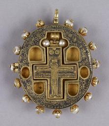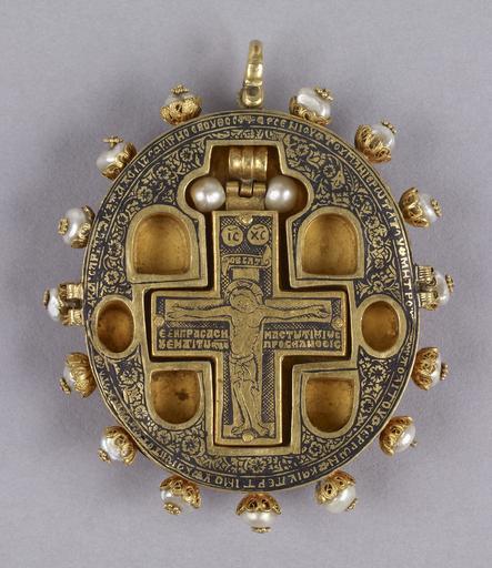 Keywords: Greek - Reliquary Pendant with Virgin and Child - Walters 571511 - Interior (2).jpg This exceptional pendant consists of a reliquary cross inside a hinged case with six small adjacent compartments for relics The impressive amethyst cameo depicting the Virgin and Child on the lid is surrounded by cabochon rubies and emeralds alternating with pearls The cross and the outer edge of the case are adorned with additional pearls and the back of the case is decorated in a similar fashion omitting the central cameo A ground of dense filigree covers the front and back of the case while the inside as well as the inscription and the Crucifixion scene on the cross are done in niello The text identifies the donor location and the time when the piece was crafted which is rare in Post-Byzantine jewelry the cross was dedicated by the Metropolitan Arsenios of Serres a town in northern Greece to the monastery of St John on the island of Chalke near Constantinople in the middle of the 16th century middle Other date century 16 Post-Byzantine gold amethyst emeralds rubies pearls semiprecious stones niello Lid cm 6 51 6 19 0 95 ; Back H with lope 3 3/8 x W 2 13/16 x D 5/8 in 8 57 x 7 14 x 1 59 cm ; Back H without lope cm 7 78 ; Cross H with lope 2 1/16 x W 1 1/4 x D 1/4 in 5 24 x 3 18 x 0 64 cm accession number 57 1511 19177 Metropolitan Arsenios Serres Greece Monastery of the Holy Trinity called Esopotron Chalke date and mode of acquisition unknown Henry Walters Baltimore date and mode of acquisition unknown Walters Art Museum Henry Walters Acquired by Henry Walters Translation 57 1511A on amethyst Mother of God / Jesus Christ; Translation 57 1511B on outer rim of inside face + Lord help Arsenius most holy and venerable metropolitan of Serres and locum tenens of Caesaria in Cappadocia; Translation 57 1511C on cross top Jesus Christ / The king of the Jews; Translation 57 1511C on face of the cross Thou hast redeemed us by Thy precious blood nailed to the cross ; Translation 57 1511C around sides of the cross a later inscription Presented by the most holy metropolitan of Serres Arsenius to the Monastery of the Holy Trinity called Esoptron on the island of Chalke Early Christian and Byzantine Art Baltimore Museum of Art Baltimore 1947 Exhibition of Gold The Cleveland Museum of Art Cleveland 1947-1948 New York World's Fair 1964 Protestant and Orthodox Pavilion Protestant and Orthodox Pavilion New York World's Fair New York 1964 Jewelry - Ancient to Modern The Walters Art Gallery Baltimore 1979-1980 The Taste of Maryland Art Collecting in Maryland 1800-1934 The Walters Art Gallery Baltimore 1984 Objects of Adornment Five Thousand Years of Jewelry from the Walters Art Gallery Baltimore Cooper-Hewitt National Design Museum New York; Chrysler Museum of Art Norfolk; Carnegie Museum of Art Pittsburgh; San Antonio Museum of Art San Antonio; Philbrook Museum of Art Tulsa; Honolulu Academy of Arts Honolulu; New Orleans Museum of Art New Orleans; Milwaukee Art Museum Milwaukee; Minneapolis Institute of Arts Minneapolis; Toledo Museum of Art Toledo; The John and Mable Ringling Museum of Art Sarasota 1984-1987 Jewelry from the Walters Art Museum and the Zucker Family Collection The Walters Art Gallery Baltimore 1987 Byzantium Faith and Power 1261-1557 The Metropolitan Museum of Art New York 2004 Bedazzled 5 000 Years of Jewelry from the Walters Art Museum Frist Center for the Visual Arts Nashville; The John and Mable Ringling Museum of Art Sarasota; The Walters Art Museum Baltimore 2006-2009 Treasures of Heaven The Cleveland Museum of Art Cleveland; The Walters Art Museum Baltimore; The British Museum London 2010-2011 place of origin Serres Greece <gallery> File Greek - Reliquary Pendant with Virgin and Child - Walters 571511 - Interior jpg </gallery> Walters Art Museum license Byzantine and Early Russian art in the Walters Art Museum Jewellery in the Walters Art Museum Art from Greece Media contributed by the Walters Art Museum needs category review Crosses in jewellery |