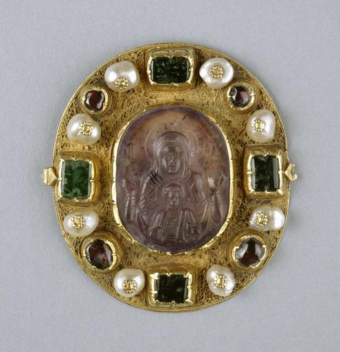 Keywords: Greek - Reliquary Pendant with Virgin and Child - Walters 571511 (2) (3).jpg This exceptional pendant consists of a reliquary cross inside a hinged case with six small adjacent compartments for relics The impressive amethyst cameo depicting the Virgin and Child on the lid is surrounded by cabochon rubies and emeralds alternating with pearls The cross and the outer edge of the case are adorned with additional pearls and the back of the case is decorated in a similar fashion omitting the central cameo A ground of dense filigree covers the front and back of the case while the inside as well as the inscription and the Crucifixion scene on the cross are done in niello The text identifies the donor location and the time when the piece was crafted which is rare in Post-Byzantine jewelry the cross was dedicated by the Metropolitan Arsenios of Serres a town in northern Greece to the monastery of St John on the island of Chalke near Constantinople in the middle of the 16th century middle Other date century 16 Post-Byzantine gold amethyst emeralds rubies pearls semiprecious stones niello Lid cm 6 51 6 19 0 95 ; Back H with lope 3 3/8 x W 2 13/16 x D 5/8 in 8 57 x 7 14 x 1 59 cm ; Back H without lope cm 7 78 ; Cross H with lope 2 1/16 x W 1 1/4 x D 1/4 in 5 24 x 3 18 x 0 64 cm accession number 57 1511 19177 Metropolitan Arsenios Serres Greece Monastery of the Holy Trinity called Esopotron Chalke date and mode of acquisition unknown Henry Walters Baltimore date and mode of acquisition unknown Walters Art Museum Henry Walters Acquired by Henry Walters Translation 57 1511A on amethyst Mother of God / Jesus Christ; Translation 57 1511B on outer rim of inside face + Lord help Arsenius most holy and venerable metropolitan of Serres and locum tenens of Caesaria in Cappadocia; Translation 57 1511C on cross top Jesus Christ / The king of the Jews; Translation 57 1511C on face of the cross Thou hast redeemed us by Thy precious blood nailed to the cross ; Translation 57 1511C around sides of the cross a later inscription Presented by the most holy metropolitan of Serres Arsenius to the Monastery of the Holy Trinity called Esoptron on the island of Chalke Early Christian and Byzantine Art Baltimore Museum of Art Baltimore 1947 Exhibition of Gold The Cleveland Museum of Art Cleveland 1947-1948 New York World's Fair 1964 Protestant and Orthodox Pavilion Protestant and Orthodox Pavilion New York World's Fair New York 1964 Jewelry - Ancient to Modern The Walters Art Gallery Baltimore 1979-1980 The Taste of Maryland Art Collecting in Maryland 1800-1934 The Walters Art Gallery Baltimore 1984 Objects of Adornment Five Thousand Years of Jewelry from the Walters Art Gallery Baltimore Cooper-Hewitt National Design Museum New York; Chrysler Museum of Art Norfolk; Carnegie Museum of Art Pittsburgh; San Antonio Museum of Art San Antonio; Philbrook Museum of Art Tulsa; Honolulu Academy of Arts Honolulu; New Orleans Museum of Art New Orleans; Milwaukee Art Museum Milwaukee; Minneapolis Institute of Arts Minneapolis; Toledo Museum of Art Toledo; The John and Mable Ringling Museum of Art Sarasota 1984-1987 Jewelry from the Walters Art Museum and the Zucker Family Collection The Walters Art Gallery Baltimore 1987 Byzantium Faith and Power 1261-1557 The Metropolitan Museum of Art New York 2004 Bedazzled 5 000 Years of Jewelry from the Walters Art Museum Frist Center for the Visual Arts Nashville; The John and Mable Ringling Museum of Art Sarasota; The Walters Art Museum Baltimore 2006-2009 Treasures of Heaven The Cleveland Museum of Art Cleveland; The Walters Art Museum Baltimore; The British Museum London 2010-2011 place of origin Serres Greece <gallery> File Greek - Reliquary Pendant with Virgin and Child - Walters 571511 jpg File Greek - Reliquary Pendant with Virgin and Child - Walters 571511 2 jpg </gallery> Walters Art Museum license Byzantine and Early Russian art in the Walters Art Museum Jewellery in the Walters Art Museum Art from Greece Madonna and Child Crosses in jewellery |