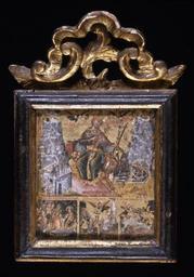 | Keywords: Greek - Saint Catherine of Alexandria with Three Scenes from Her Life - Walters 372753.jpg According to legend Saint Catherine was a learned noble maiden from the Egyptian city of Alexandria who was martyred in the early 4th century on account of her Christian faith The three small scenes at the bottom of this panel illustrate episodes from her life the Roman empress is persuaded by Catherine to become a Christian; Catherine is beheaded by order of the pagan emperor; angels carry the saint's body to the top of a mountain on the Sinai Peninsula below is depicted the vision of Saint Eusthatius who was converted to Christianity when while hunting he saw a deer with a crucifix between its antlers The Monastery of Mount Sinai founded in the 6th century is now dedicated to Saint Catherine Its compound with two pilgrims approaching from the left is shown in the lower left corner of the upper larger composition Above it is Mount Sinai itself with several small chapels on its slopes and Moses receiving the Tablets of the Law on its summit Saint Catherine is portrayed in royal dress Two angels crown her with laurel wreaths and she holds a cross and a palm branch that signify her martyrdom for Christ To her right is a spoked wheel by means of which she was tortured before her execution Books compasses and an armillary sphere betoken Catherine's learning Behind them is Mount Catherine where the saint's body was miraculously rediscovered by the Sinai monks centuries after her death century 18 Early Modern tempera panel cm 15 88 15 24 approx accession number 37 2753 34067 Zoumboulakis Athens Greece by purchase Richard Howland Washington DC 1951 by purchase Walters Art Museum Gift of Richard Hubbard Howland 1998 Translation The empress came to believe in Christ The beheading of the saint The angels carried the saint s body to the mountain place of origin Greece Walters Art Museum license 3D Byzantine and Early Russian art in the Walters Art Museum Art from Greece Paintings in the Walters Art Museum Media contributed by the Walters Art Museum needs category review |