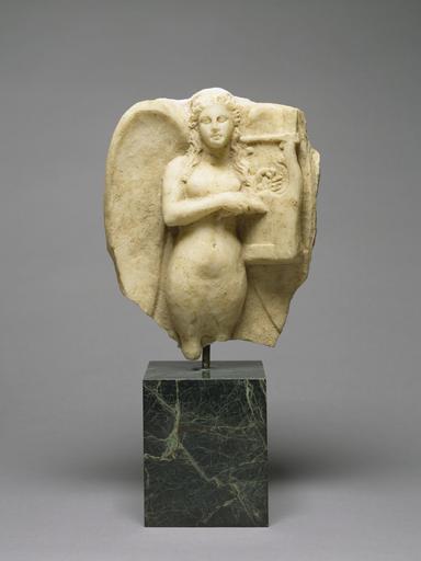 | Keywords: Greek - Siren with a Kithara from a Grave Monument - Walters 233.jpg This expressive figure of a mournful siren playing the kithara a musical instrument like a lyre originally crowned a funerary monument Sirens were mythical creatures that were part-woman part-bird who while best known as temptresses also used their powers of song to praise men of great fame and thus appear frequently on funerary monuments of the 4th century 2nd half 4th century BC Classical Pentelic marble cm 21 6 17 5 5 7 ; Mount cm 11 3 9 5 9 5 ; H including base cm 33 8 accession number 23 3 31125 Joseph Brummer New York date and mode of acquisition unknown Henry Walters city Baltimore Walters Art Museum Henry Walters Acquired by Henry Walters 1924 The Odyssey and Ancient Art Edith C Blum Art Institute Bard College Annandale-on-Hudson 1991-1992 Ulisse Il mito e la memoria Ulysses The Myth and Memory Palazzo delle Esposizioni Rome 1996 Ulysses Myth and Memory Haus der Kunst Munich 1999-2000 Things With Wings Mythological Figures in Ancient Greek Art The Walters Art Museum Baltimore 2005-2006 Things With Wings Mythological Figures in Ancient Greek Art Ward Museum Salisbury 2009 Heroes Mortals and Myths in Ancient Greece The Walters Art Museum Baltimore; Frist Center for the Visual Arts Nashville; San Diego Museum Of Art San Diego; Alexander S Onassis Public Benefit Foundation USA New York 2009-2011 place of origin Athens Greece Walters Art Museum license Ancient Greek sculptures in the Walters Art Museum Art from Greece Media contributed by the Walters Art Museum needs category review |