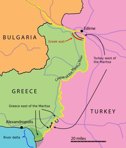 | Keywords: Greek Turkish Bulgarian borders and maritsa river.svg en The course of the Maritsa River indicating where Greek land lies east of it and where Turkish land lies west of it Also showing where it enters Bulgaria and ceases to form a national boundary National boundaries are shown in black Maritsa shown in yellow regional roadways shown in transparent blue Greek barrier wall shown as red line near Edirne 2015-09-07 own KDS4444 other versions cc-zero Uploaded with UploadWizard Maps of rivers in Greece Maps of rivers in Turkey Greece “Turkey border |