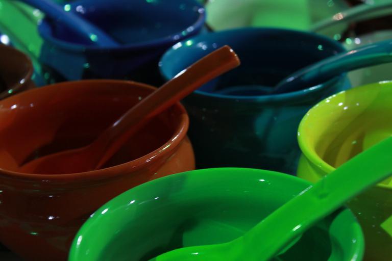 Keywords: green blue brown ceramic bowls colorful soups spoon