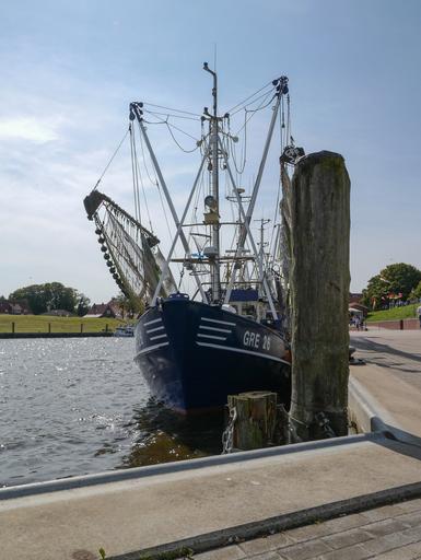 Keywords: greetsiel port coast ship fishing vessel day tradition sea clouds sun water east frisia