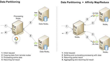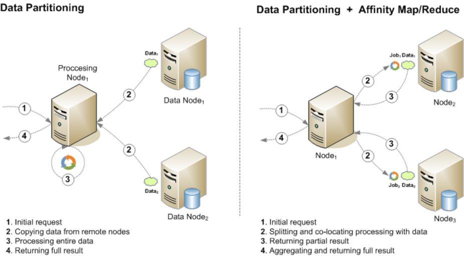| Keywords: Gridgain affinity.png  en The diagram illustrates the difference between using data grids without and with GridGain The left side shows execution flow without GridGain in which a remote data server is queried for data the data is then delivered to caller master node which is faster than DB access but results into unnecessary network traffic On the right hand side you can see the value that GridGain brings to the picture The whole computation logic together with data access logic is brought to data server for local execution Assuming that serialization of computation logic is much lighter than serializing data the network traffic in this case is minimal Also your computation may access data from both Node 2 and Node 3 In this case GridGain will split your computation into logical jobs and route appropriate logical jobs to the corresponding data servers to ensure that all computations still remain local Now if one of the data server nodes crashes your jobs will be automatically failed-over to other nodes which allows you to fail-over logic together with data not just data fail-over provided by data grids or distributed caches Own Ne vasya Computer network diagrams |