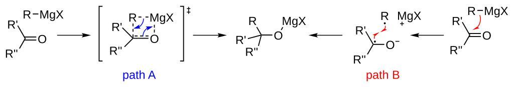 Keywords: Grignard reaction mechanism.svg Two mechanisms for Grignard reaction Selfmade with ChemDraw 2006-12 Calvero PD Unknown Grignard reactions