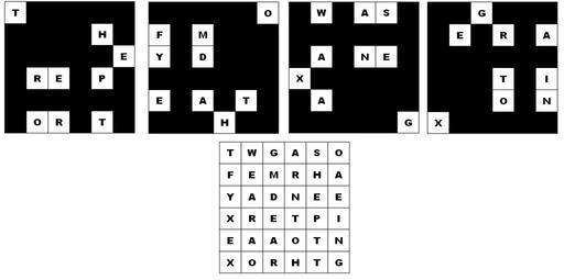 | Keywords: Grille cipher.png  mřížky The report of my death was an exaggeration Zprávy o mé smrti nesmírně přeháněly Na konci je přidáno písmeno X aby celková délka zprávy odpovídala počtu polí tabulky Cryptographic grille used to encrypt Mark Twain's quote The report of my death was an exaggeration The letter X at the end is added as padding own Joker Island 2011-08-24 Cc-zero Classical ciphers |