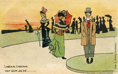 | Keywords: Een verduiveld rare snuiter in mijn vriend Frans Lindeman Daar de man 't fatale kussen absoluut niet laten kan Ziet hij slechts een aardig zusje, dad'lijk is hij achter haar Steelt dan plotseling een kusje, onverschillig wie of waar Of 't nu middag is of avond, zij 't een freule of boerin Niets is er dat hem terughoudt van zijn dolle kus-waanzin refr. Lindeman, Lindeman, wat gaan jou toch die meisjes an Lindeman, Lindeman, wat gaan jou toch die meisjes an Al die gekke liefdeskuren zullen jou nog een bezuren Lindeman, Lindeman, wat gaan jou toch die meisjes an Net zo als ik 't hem voorspeld had, kwam het dan ook spoedig uit Dicht bij een hotel gekomen, liep een schone ons vooruit Frans liep vlug met grote stappen, kust de dame, op de trap Doch haar man en nog twee kellners zagen alles van die grap Pats, daar vliegt zijn hoed de straat op, dan zijn stok, lorgnet en das En bebloed aan neus en handen ligt mijn vriend dra in een plas refr. Een verduiveld rare snuiter in mijn vriend Frans Lindeman Daar de man 't fatale kussen absoluut niet laten kan Ziet hij slechts een aardig zusje, dad'lijk is hij achter haar Steelt dan plotseling een kusje, onverschillig wie of waar Of 't nu middag is of avond, zij 't een freule of boerin Niets is er dat hem terughoudt van zijn dolle kus-waanzin refr. Lindeman, Lindeman, wat gaan jou toch die meisjes an Lindeman, Lindeman, wat gaan jou toch die meisjes an Al die gekke liefdeskuren zullen jou nog een bezuren Lindeman, Lindeman, wat gaan jou toch die meisjes an Net zo als ik 't hem voorspeld had, kwam het dan ook spoedig uit Dicht bij een hotel gekomen, liep een schone ons vooruit Frans liep vlug met grote stappen, kust de dame, op de trap Doch haar man en nog twee kellners zagen alles van die grap Pats, daar vliegt zijn hoed de straat op, dan zijn stok, lorgnet en das En bebloed aan neus en handen ligt mijn vriend dra in een plas refr. |