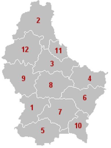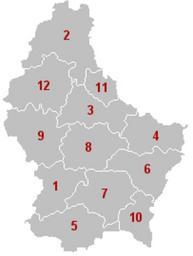 | Keywords: Groothertogdom LuxemburgKantons.png ----- Nr Canton/Kanton District ----- 1 Capellen Luxembourg ----- 2 Clervaux Diekirch ----- 3 Diekirch Diekirch ----- 4 Echternach Grevenmacher ----- 5 Esch-sur-Alzette Luxembourg ----- 6 Grevenmacher Grevenmacher ----- 7 Luxembourg Luxembourg ----- 8 Mersch Luxembourg ----- 9 Redange Diekirch ----- 10 Remich Grevenmacher ----- 11 Vianden Diekirch ----- 12 Wiltz Diekirch Mapa de Luxemburgo indicando la división territorial en cantones Cada número corresponde a un cantón en la lista de la izquierda Map of the cantons in the Grand Duchy of Luxembourg Kaart van de kantons in het Groothertogdom Luxemburg Carte des cantons du Grand-Duché de Luxembourg - was Kantonskaart eigen werk LennartBolks Maps of cantons of Luxembourg |
