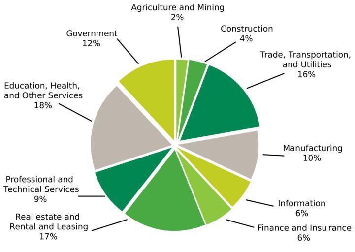 | Keywords: Gross Domestic Product of California 2008 (millions of current dollars).svg Gross Domestic Product of California 2008 millions of current dollars All Industries NAICS classification own Created with Adobe Illustrator ValidSVG Cite web Gross Domestic Product by State Bureau of Economic Analysis 2008 http //www bea gov/regional/gsp/ 2010-01-31 2010-01-31 Optigan13 Gross Domestic Product of California 2008 millions of current dollars NL svg wikitable - Industry Millions of current dollars Notes - Agriculture and Mining 43333 - Construction 67770 - Trade Transportation and Utilities 299645 Includes Wholesale trade and retail trade - Manufacturing 181134 - Information 112752 Includes Publishing including software Motion picture and sound recording industries Broadcasting and telecommunications - Finance and insurance 107587 - Real estate and rental and leasing 308737 - Professional and technical services 174627 - Education health and other services 334408 Management Administrative waste Educational Health care social assistance other services except gov't arts entertainment recreation accommodation and food services - Government 216764 Economy of California Economic pie charts |