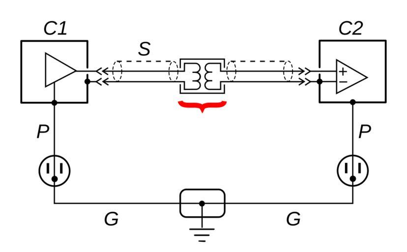 | Keywords: Ground loop solution - isolation transformer.svg isolation transformer in the signal cable A ground loop is an inadvertent electrical circuit or loop created by the ground wiring of electrical equipment Ground loops are a major cause of hum and interference in audio video and computer equipment because circulating currents induced by stray magnetic fields from nearby 50/60 Hz equipment can cause AC voltage dropped across signal grounds In this diagram two AC powered electronic components C1 and C2 are connected by a shielded signal cable S The ground shield of S along with the ground wire third wire P in the components' power cord and the building's utility ground wiring G form a ground loop <br /> One of the best ways to prevent such a ground loop is to insert an isolation transformer in the signal cable S as shown The transformer breaks the conductive path between the ground terminals of the components opening the loop preventing ground loop currents from flowing while allowing the AC signal to pass Unlike other solutions such as breaking the cable ground shield the isolation transformer can be used with a floating component one with no ground wire in its power cord without causing hum Cables incorporating isolation transformers can be purchased 2014-01-20 17 19 32 own Chetvorno cc-zero Uploaded with UploadWizard Ground loops |