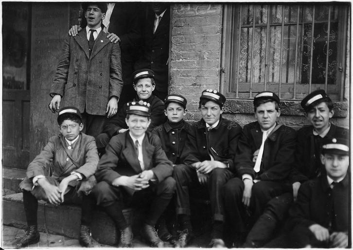 | Keywords: Group of dime messenger service boys - NARA - 523533.tif Scope and content Group of dime messenger service boys The youngest boys are Eddie Tahory 14 years old said to be a recent comer From a questionable home Mother eloped with boader two children with her They said they never knew when they were going to get home nights Usually work one or more nights a week Have worked until after midnight They said that last Christmas their office had a nine year old boy running errands for them and that he had made a great deal of money from tips They make 7 a week and more sometimes Said The office is not allowed to send us into the red light district but we go when a call comes Not very often Washington D C General notes 523533 Local identifier 102-LH-2911 Department of Commerce and Labor Children's Bureau 1912 - 1913 NARA-Author Hine Lewis Wickes 1874-1940 Photographer 1122914 <br /> Still Picture Records Section Special Media Archives Services Division NWCS-S National Archives at College Park 8601 Adelphi Road College Park MD 20740-6001 1912-04-11 Record group Record Group 102 Records of the Children's Bureau 1908 - 2003 Record group ARC 431 National Child Labor Committee Photographs taken by Lewis Hine compiled ca 1912 - ca 1912 documenting the period 1908 - 1912 Series ARC 523064 File unit File unit ARC Variant control numbers NAIL Control Number NWDNS-102-LH-2911 yes Other versions <gallery> File Group_of_dime_messenger_service_boys_-_NARA_-_523533 tif tif File Group_of_dime_messenger_service_boys_-_NARA_-_523533 jpg jpg </gallery> NARA-cooperation PD-USGov Child labor in the United States NARA TIF images with categorized JPGs |