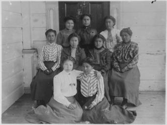 Keywords: Group of young Indian women (9). - NARA - 297575.jpg Scope and content Back row center Mrs George Williams sister of Alex Guthrie and niece of Josiah Guthrie Front row left Ed Benson's daughter Alice--married Henry Rudland Front row right Mrs Frank Hamilton adopted daughter of Ernest Milton Center row right Mrs Moses Hewson Niece Annie Guthrie Others Unidentified General notes 297575 Local identifier Wellcome Henry S Henry Solomon Sir 1853-1936 NARA's Pacific Alaska Region Anchorage NRIAA 654 West Third Avenue Anchorage AK 99501-2145 Record group Collection WME Sir Henry Wellcome Collection 1856 - 1936 Record group ARC 1208 Photographs of the Inhabitants of Metlakatla British Columbia and Metlakatla Alaska compiled ca 1856 - 1936 Series ARC 297169 File unit File unit ARC Variant control numbers NAIL Control Number NRIA-WME-PHOTOS-P556<br /> Other Identifier Box 277 Other versions <gallery> File Group_of_young_Indian_women_ 9 _-_NARA_-_297575 tif tif File Group_of_young_Indian_women_ 9 _-_NARA_-_297575 jpg jpg </gallery> NARA-cooperation PD-USGov People of Metlakatla Alaska Josiah Guthrie Moses Hewson |