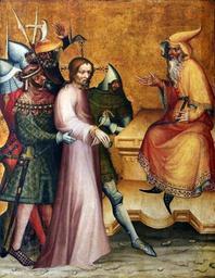 | Keywords: Grudziądz Polyptych 07.jpg Artwork Creator Master of the Trebon Altarpiece ca 1390 tempera gold panel cm 123 93 Institution National Museum Warsaw accession number Śr 22 object history credit line Władysław Łoś Jolanta Meder-Kois 1993 Poliptyk Grudziądzki a czeskie malarstwo gotyckie Uwagi wstępne Technologia artis The Yearbook of the Historical Art Technology Prague no 3 pp 70-76 http //www culture pl/image/image_gallery image_id 50953 t 135828254404 www culture pl See below PD-old-100 DEFAULTSORT 1390 circa; Christ before Pilate Grudziądz Polyptych Paintings of Christ before Pilate Jewish hat |