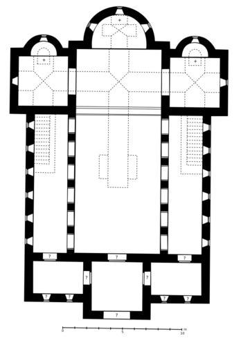Keywords: Grundriss Einhardsbasilika Rekonstruktion Müller.svg Einhardsbasilika Steinbach Germany de Grundriss der Einhardsbasilika Steinbach <br/> Aus de Bild Grundriß_Rekonstruktion_Müller jpg Der Grundriß zeigt die Basilika in ihrer karolingischen Gestalt Am unteren Bildrand erkennbar das Atrium mit den danebenliegenden Vorräumen Diese drei Räume fielen der romanischen Erweiterung von 1182 zum Opfer an ihre Stelle traten die Türme und das romanische Westportal Die heutige westliche Mauer von 1588 mit den erkennbaren romanischen Werkteilen erhebt sich dort wo in der Rekonstruktionszeichnung die westliche Mauer des Atriums steht Die ursprüngliche Westseite des Hauptschiffs so wie hier gezeichnet existiert nicht mehr Die Grundmauern dieser karolingischen Räume sind heute in der Basilika wieder erkennbar An den nördlichen Nebenchor schließt sich heute der Winterchor von 1168 an Die Seitenschiffe wurden 1972/73 wieder aufgemauert Es fehlt heute der südliche Nebenchor und der darunter liegende Teil der Krypta Die gestrichelten Linien sind die Umrisse der darunter liegenden Krypta im karolingischen und bis heute unveränderten Zustand Am westlichen Ende des Mittelgangs finden sich die beiden ungenutzten Arkonsolnischen für die Gebeine Einhards und seiner Frau Own work based on de Bild Grundriß_Rekonstruktion_Müller jpg by de Benutzer Capaci34 based on the dissertation of Dr Otto Müller MaEr SVG version de Benutzer Capaci34 JPG version 25 August 2008 MaEr 2008-03-26 Capaci34 49 41 15 N 08 59 48 E Plans of Einhardsbasilika Steinbach Reconstruction drawings of medieval buildings in Germany |