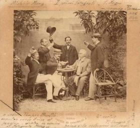 Keywords: Gruppo di artisti - Michele Mang.jpg Michele Mang ; positivo all ™albumina 95 x 105 montato su cartoncino Sul retro timbro Michele Mang C Piazza di Spagna 9 Roma “ Italia Michele Mang On the back stamp Michele Mang C Piazza di Spagna 9 Rome - Italy 2004-07-22 http //www internetculturale it/opencms/opencms/it/pagine/mostre/pagina_171 html Internet Culturale Michele Mang other versions Custom license marker 2015 01 26 PD-old Uploaded with UploadWizard Black and white photographs of men Toasting Wine drinking Michele Mang |