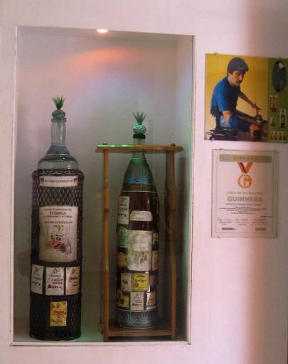 Keywords: Guinness Tequila Bottles.jpg en Two hand blown tequila bottles with certificate verifying them as largest hand-blown bottles by Guinness Book of World Records on display at the National Museum of Tequila Own Thelmadatter 2009-04-09 Glass bottles Guinness World Records National Museum of Tequila |