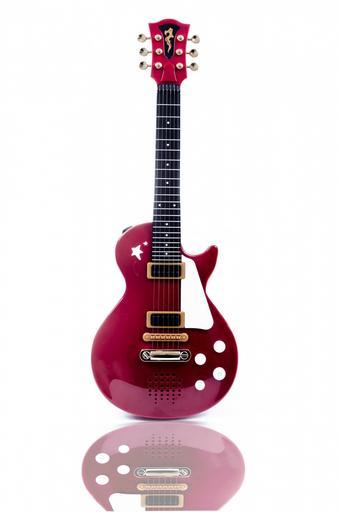 Keywords: guitar jazz music musical neck band rock song sunburst rosewood close-up isolated electric string white red beat sing musician toy
