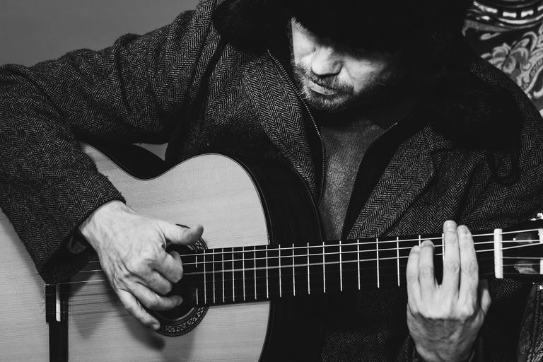 Keywords: guitar strange bizarre oblique guitarist coat urss ushanka russian hat play man bart